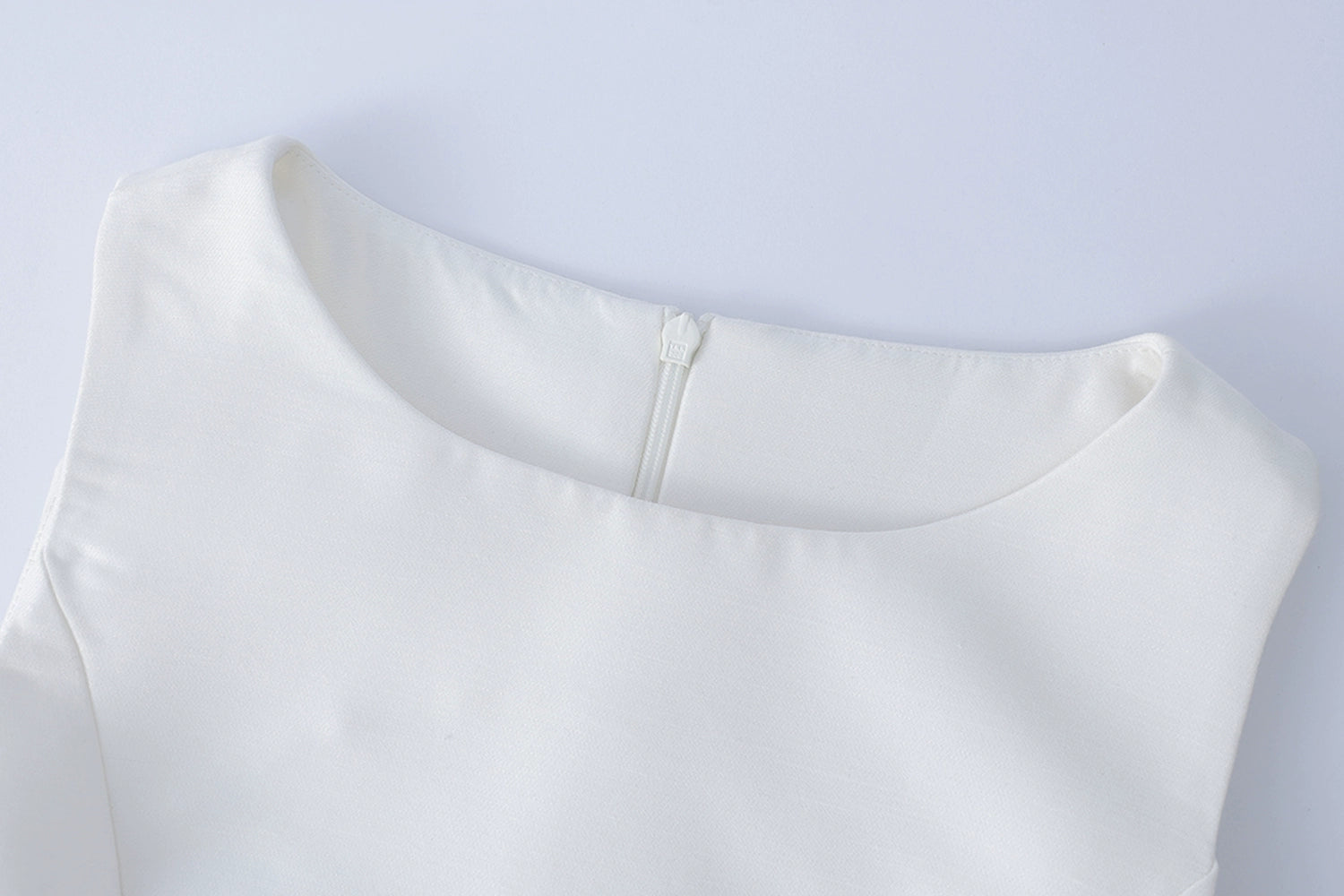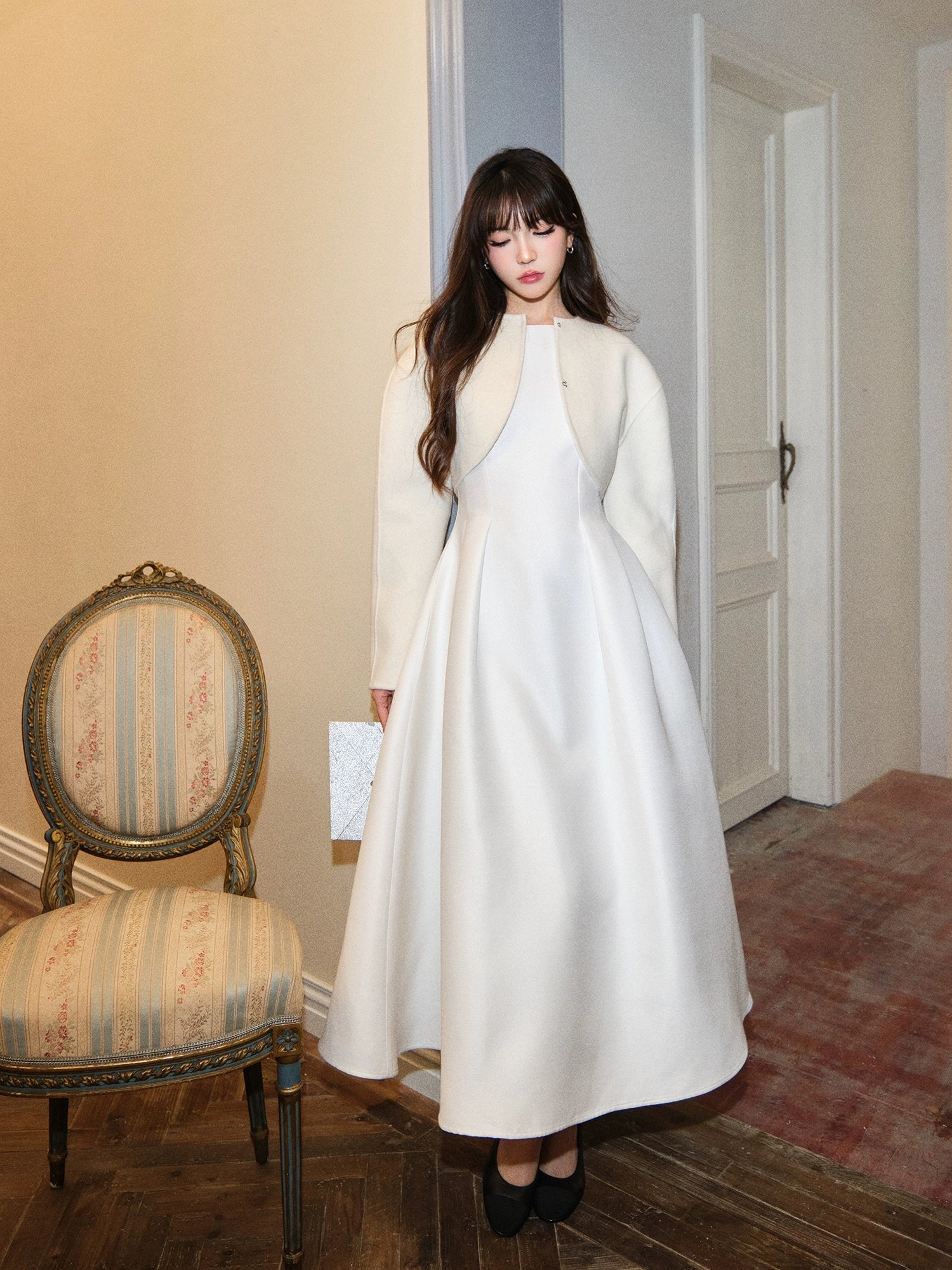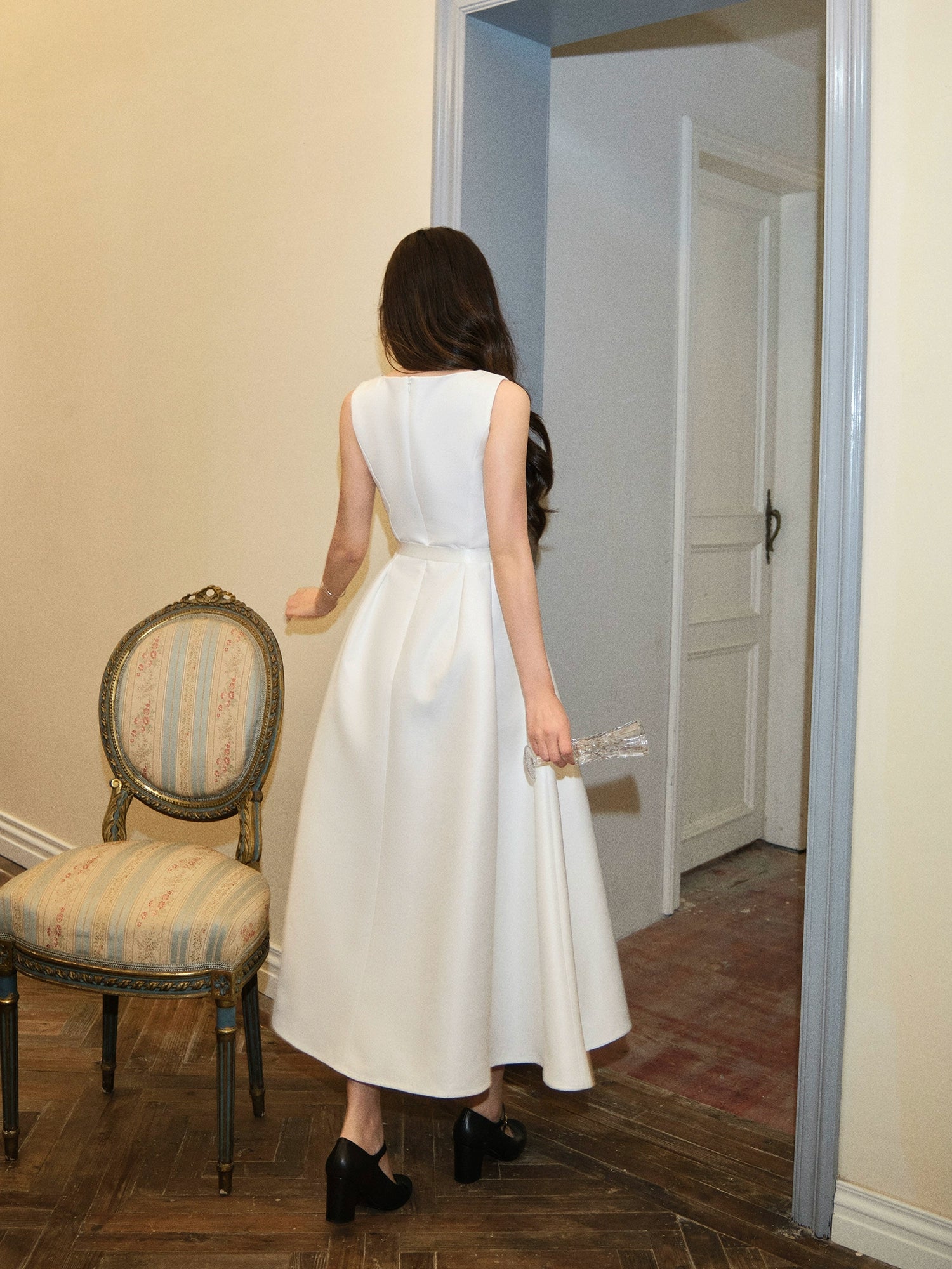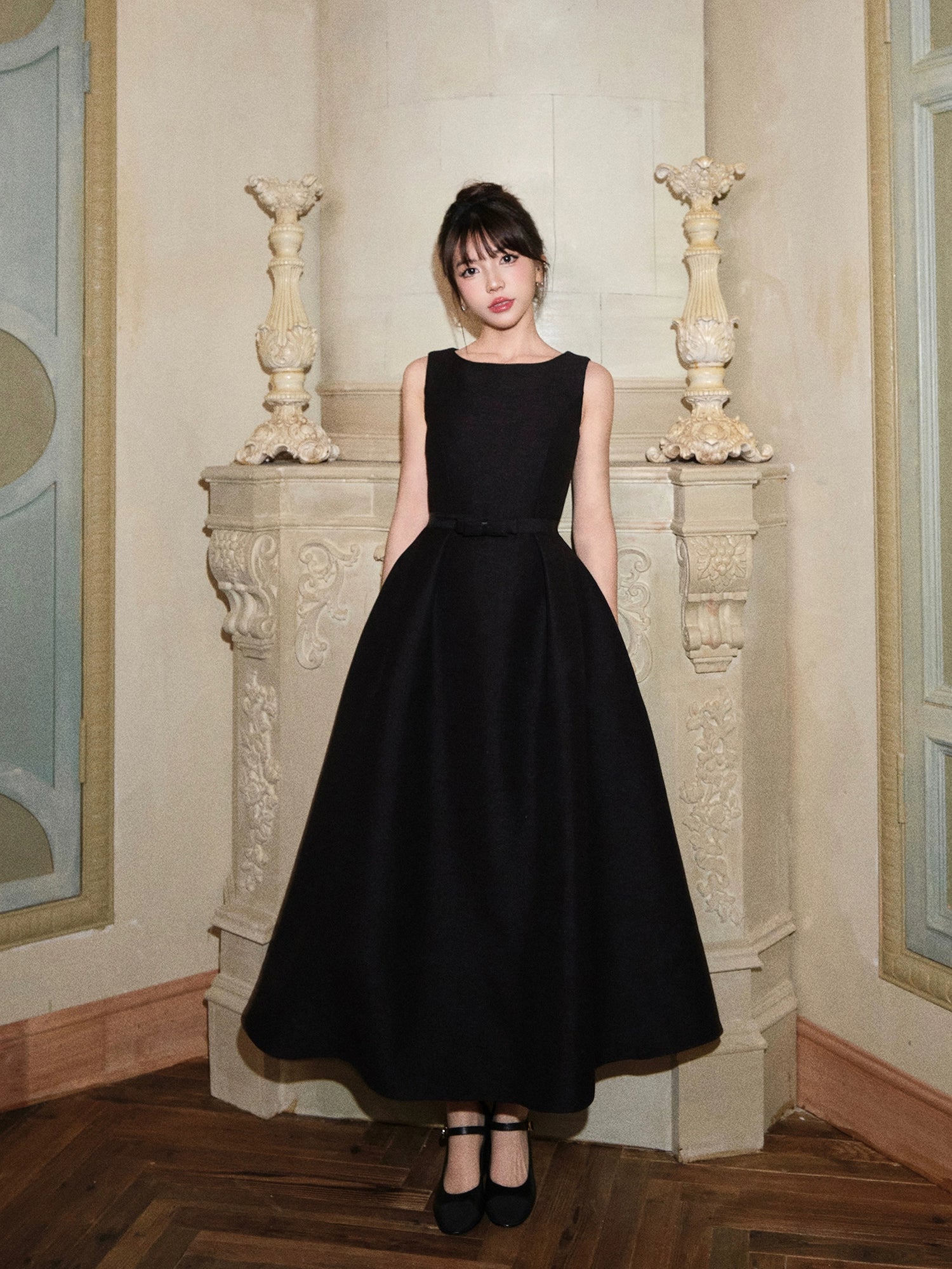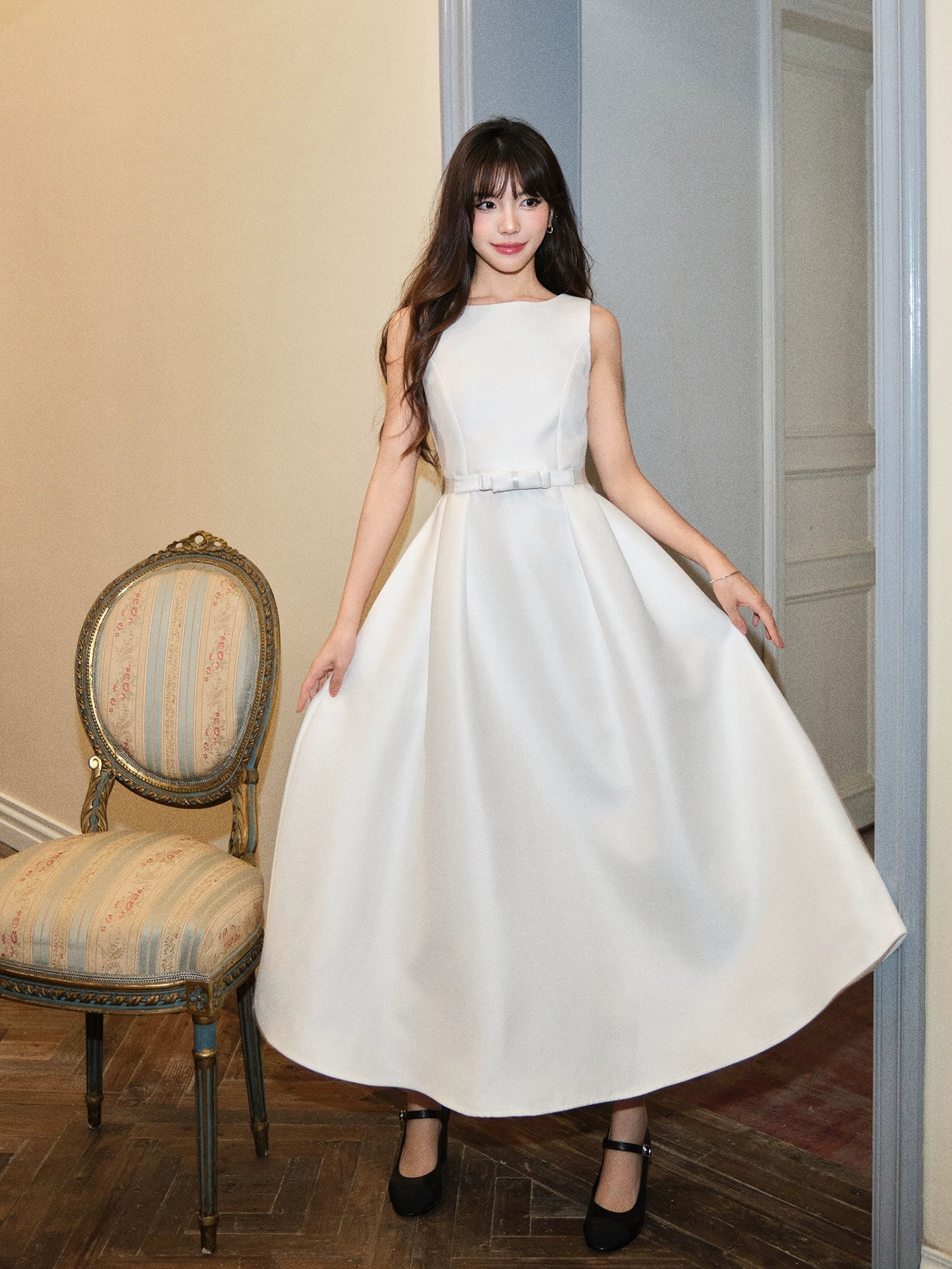 シンプルでありながら存在感を放つ、クラシカルなノースリーブロングドレス。