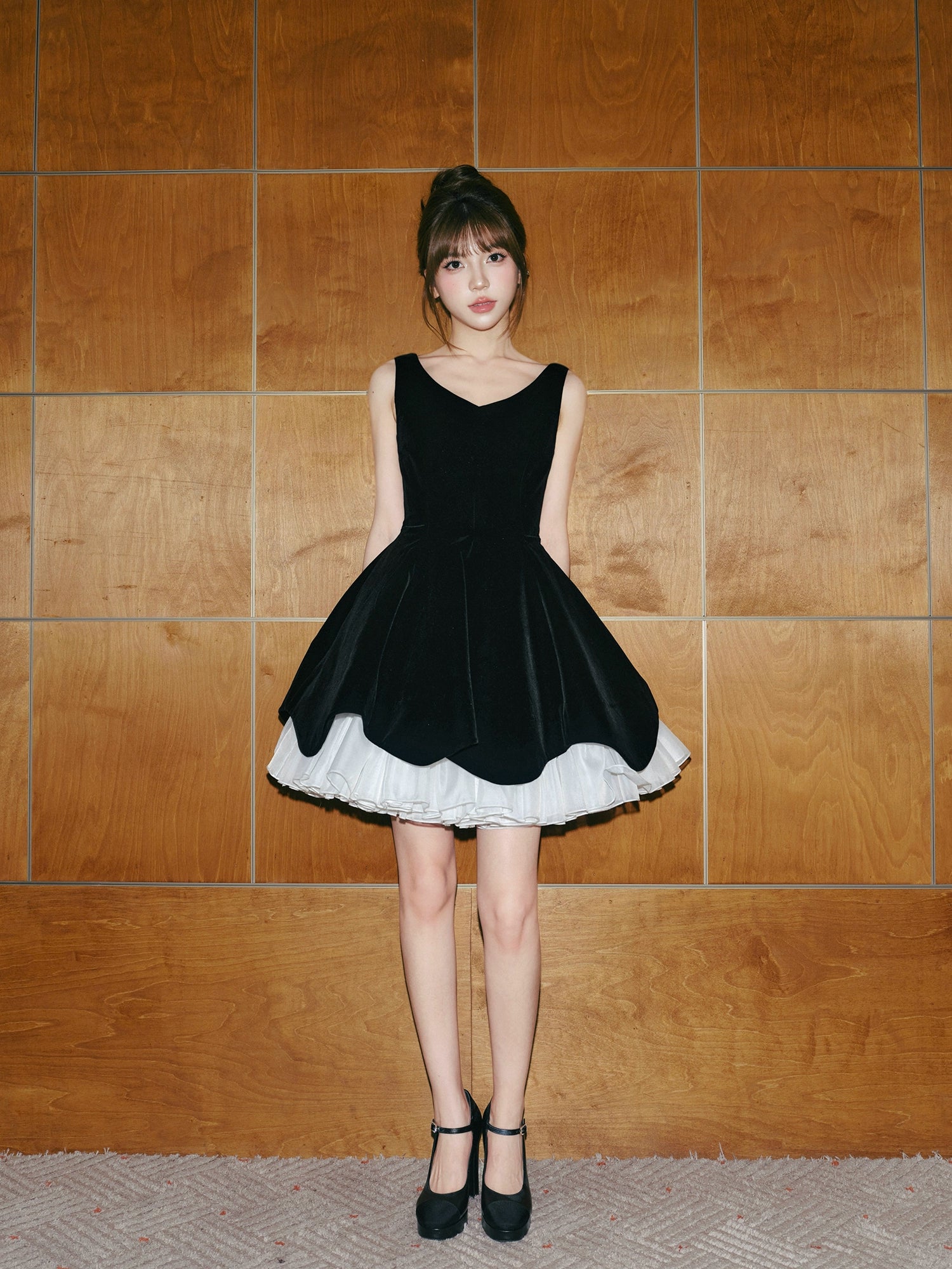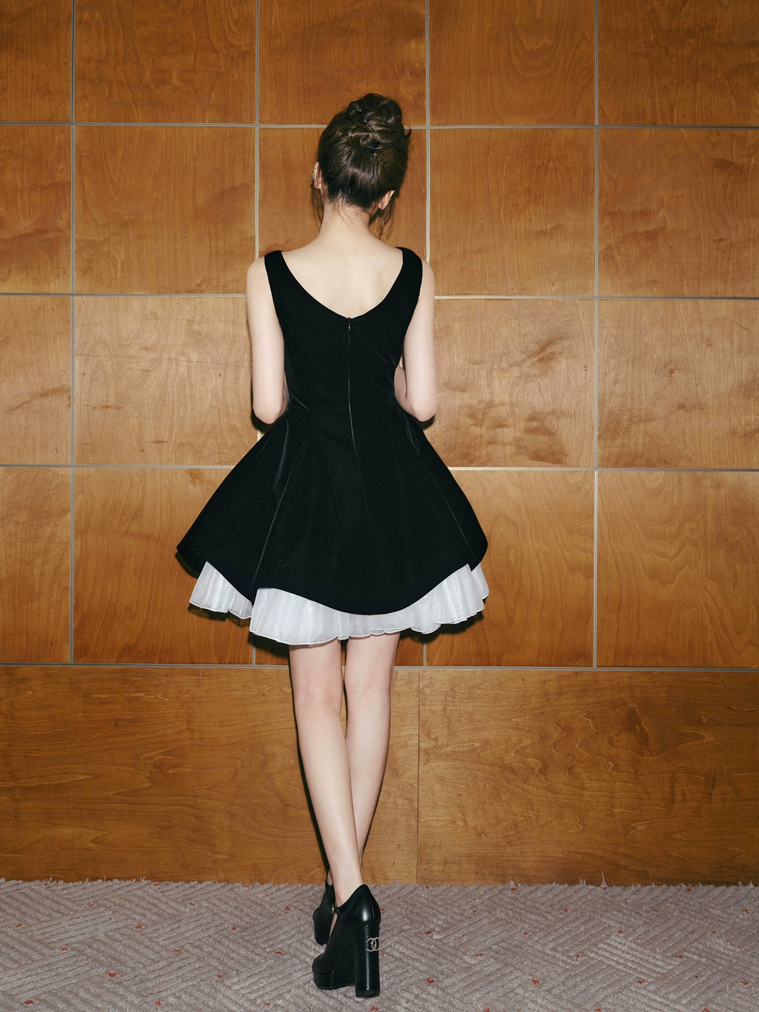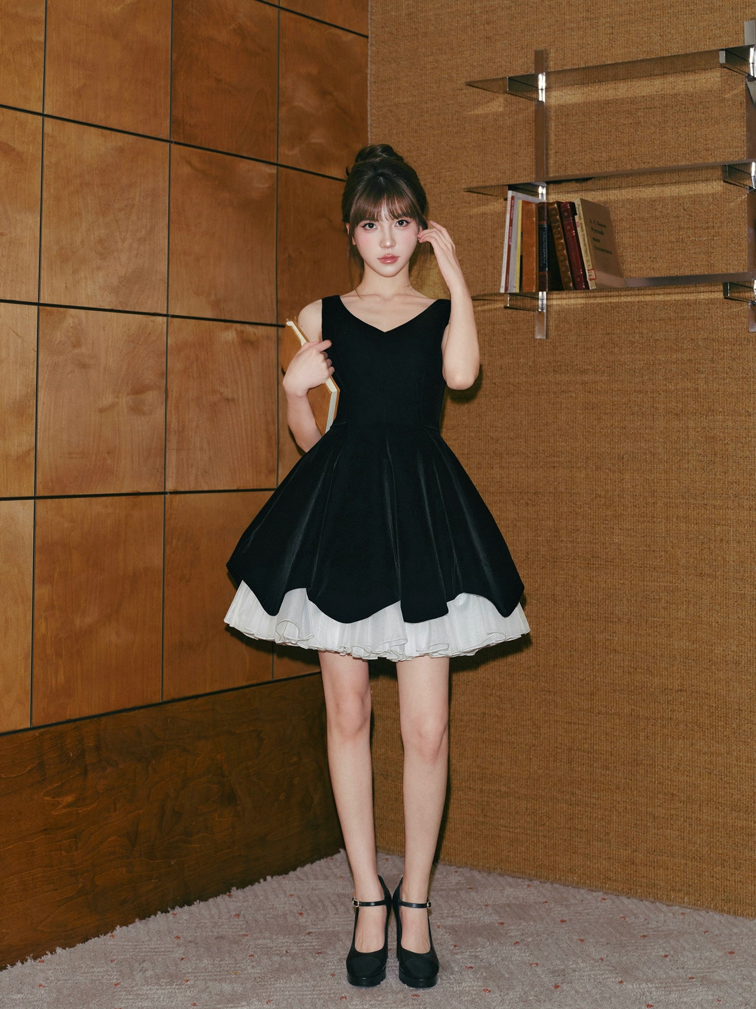 深みのあるベロア素材に、ふんわり広がるチュチュを重ねたプリンセスドレス。